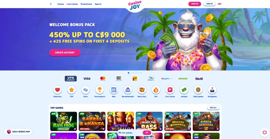 CasinoJoy is a top online casino in Canada that balances game variety with exciting promotions. The casino also supports flexible payment options, but that’s not all. At a glance, this site features a clean design that makes navigation easy. Its white and blue hues are soothing to the eyes, and you can easily spot different sections of the casino. The game lobby is also well-arranged, allowing players to filter options or search for titles. In the game catalogue, you’ll find exciting slots, table games, and live dealer casino games. These offerings are designed to appeal to both casual and seasoned gamers.