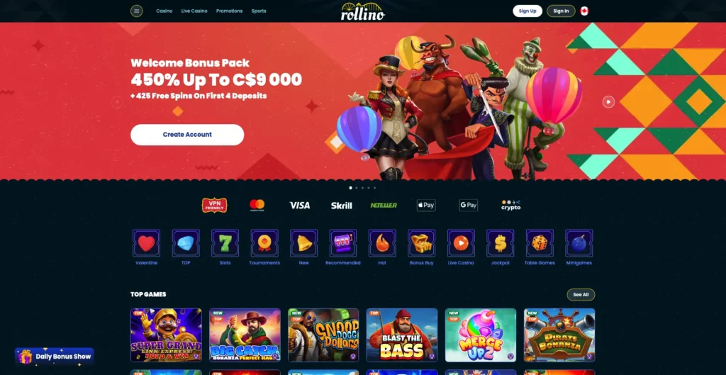 Furthermore, this online casino offers Canadians one of the most generous welcome packages. Also, there are many deposit bonuses and free spins to provide existing gamers with extra playing resources. Incentives for continued play include seasonal promotions, ongoing reloads, and VIP/loyalty rewards. For Canadian players, Rollino offers a wide range of payment options. You’ll find traditional cards (Visa, Mastercard), e-wallets, and locally used options like Interac. All of these payment options are available for instant deposits. You can also use cryptocurrency options like Bitcoin or Ethereum to initiate payments. Interac e-Transfer and other methods may take a few business days to process withdrawals. However, most e-wallet and cryptocurrency withdrawals are processed within 24 hours of approval. Please note that there are withdrawal limits; please review them carefully.
